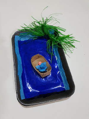 Em pratinhos de isopor colocou papel azul simbolizando o rio, papel de bala verde simbolizando o mato ao redor do rio e um bonequinho na cestinha.